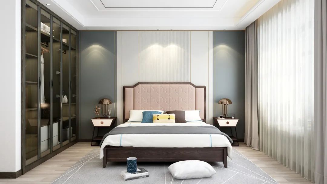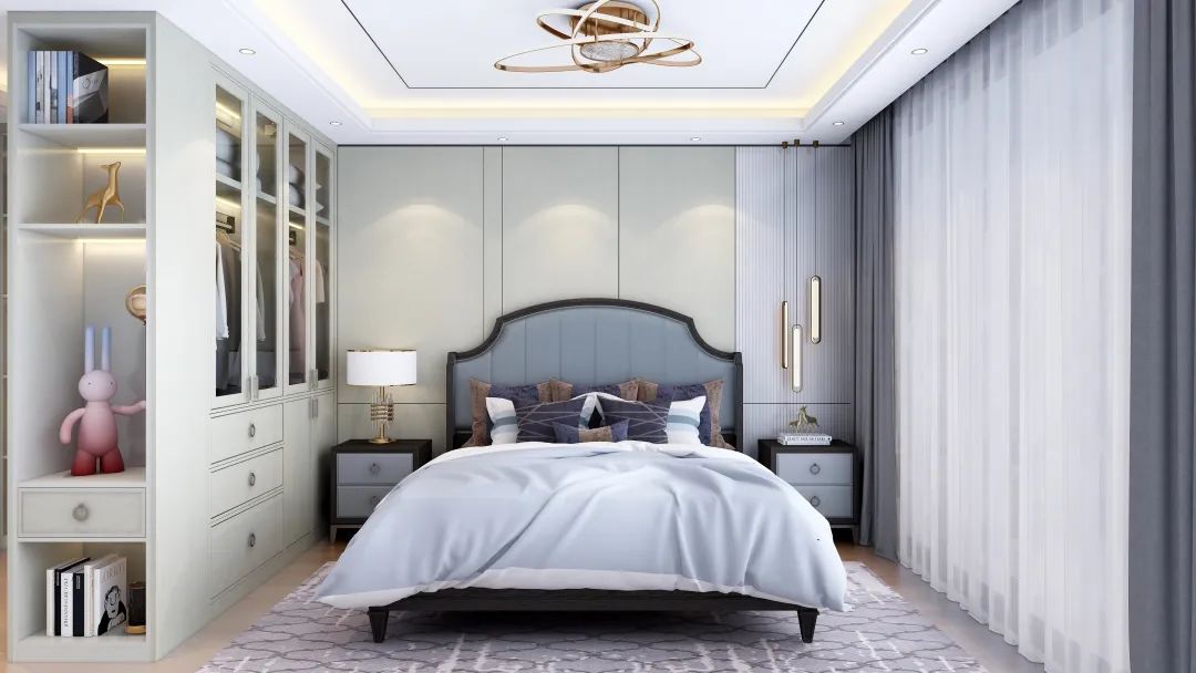 淡蓝色也是冷静色,可以使人更加容易入睡。床屏的边缘采用了铆钉镶嵌,在光线照射下可提亮空间,使床屏看起来更加精致,更有轻奢的高级感。